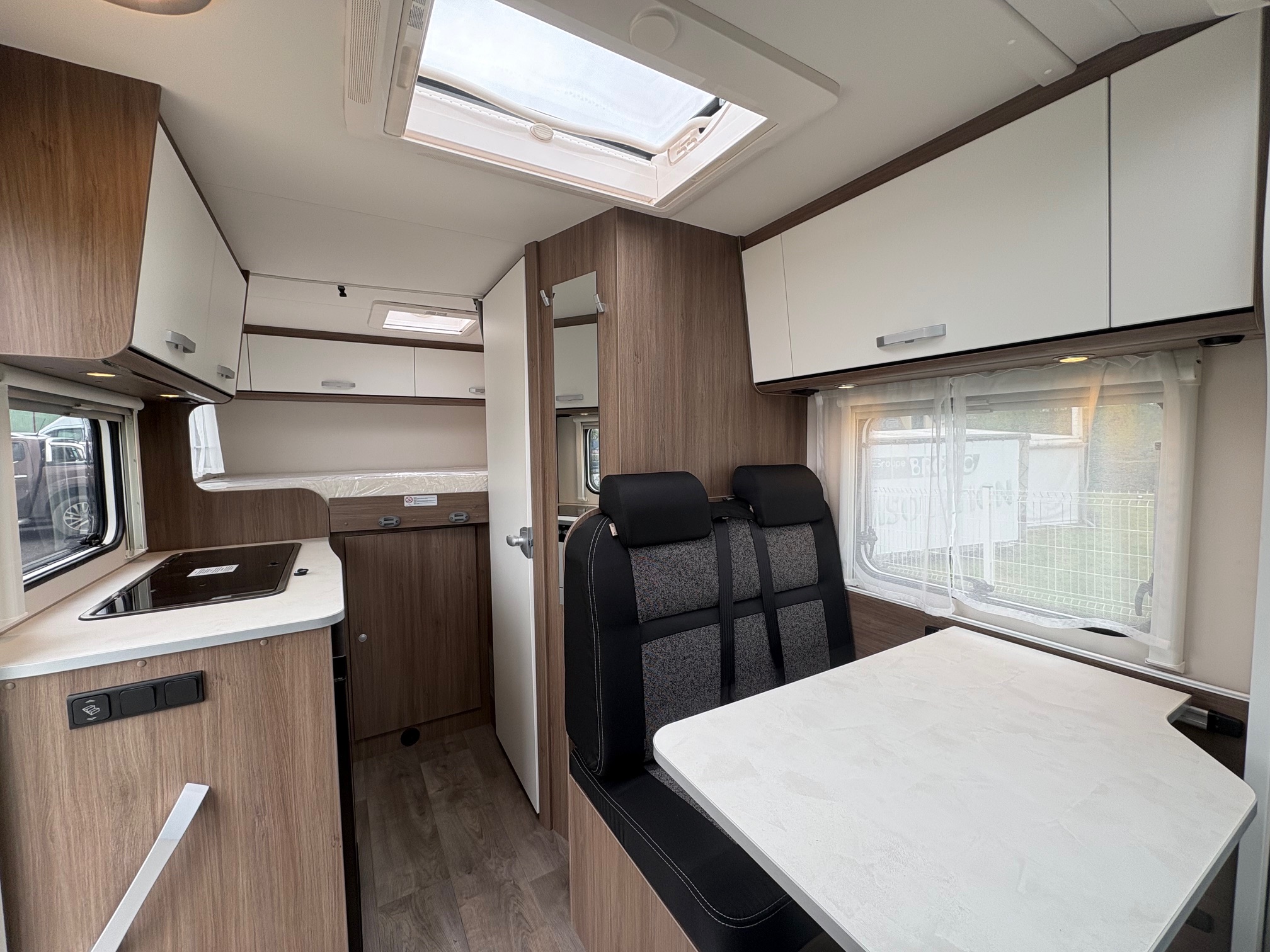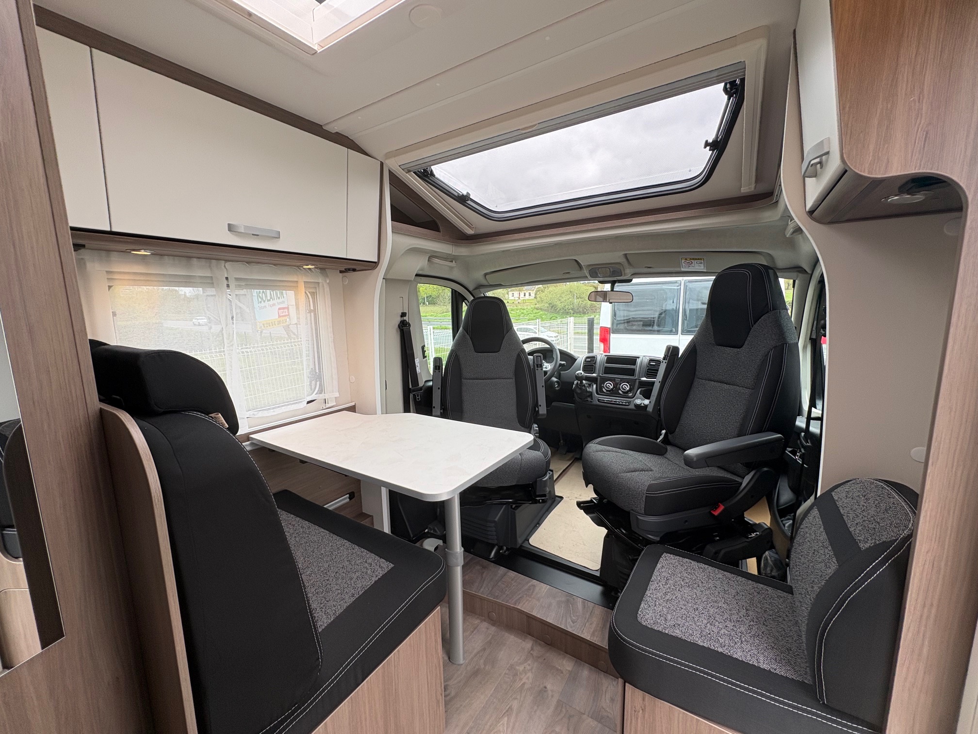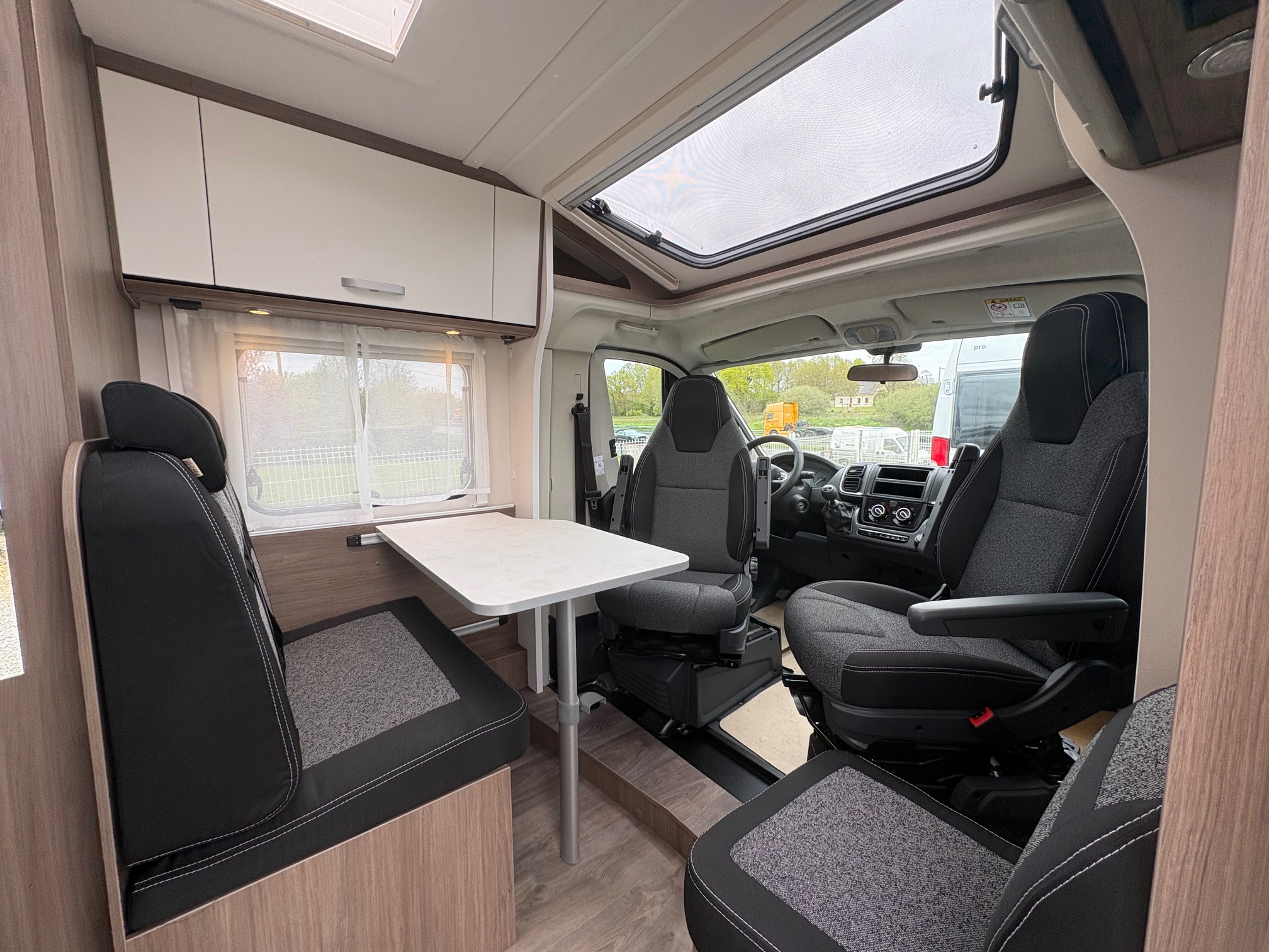 Couleur extérieur gris Artense métalisée, Store plissés de cabine, Toit panoramique de cabine, Coloris spécifique des portes des meubles de pavillon en blanc cosy, Sérigraphie Pro+, Store extérieur 4m, Réservoir eaux usées isolé, Pare-chocs avant peint, Skip plate coloris noir brillant, Feux antibrouillards, Volant et pommeau cuir, Tableau de bord avec applications techno-trim, Jantes alu 16″