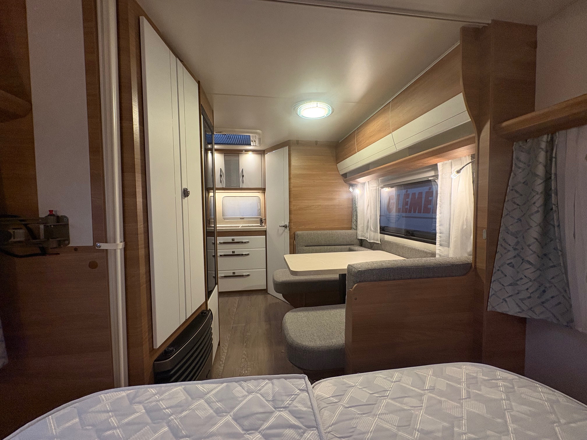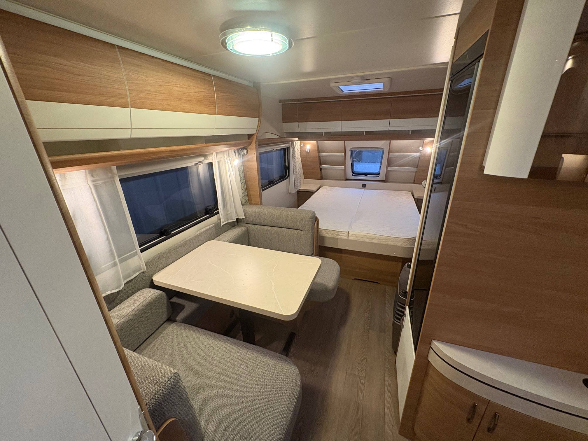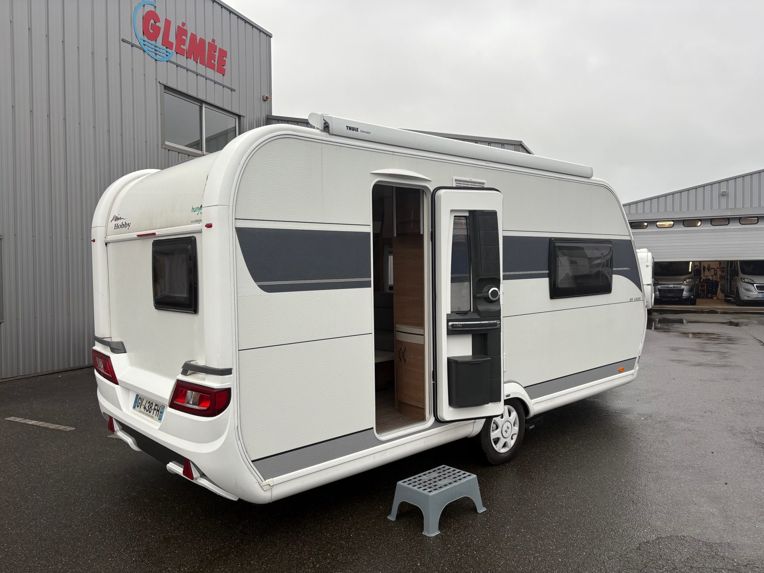 Caravane HOBBY avec un lit central, en très bon état.
