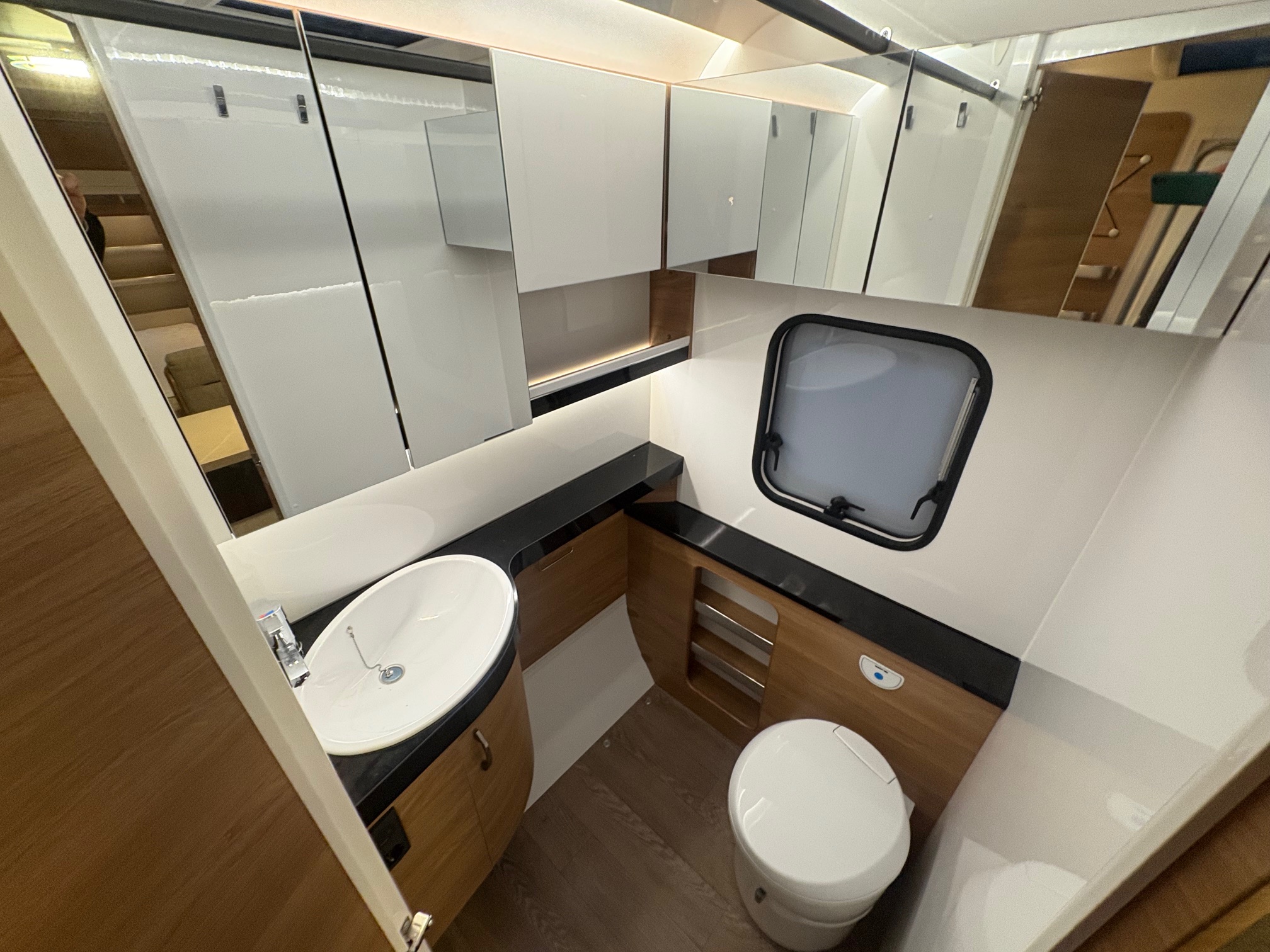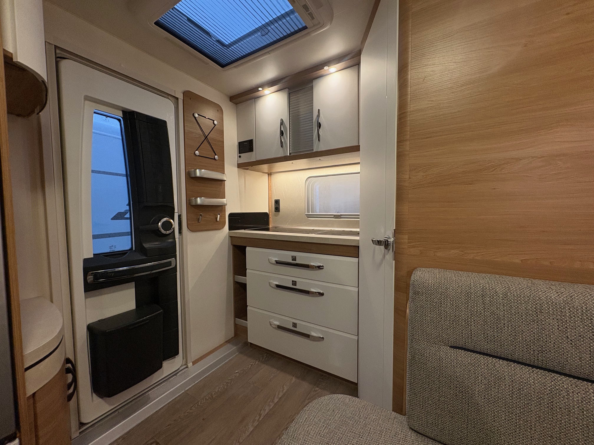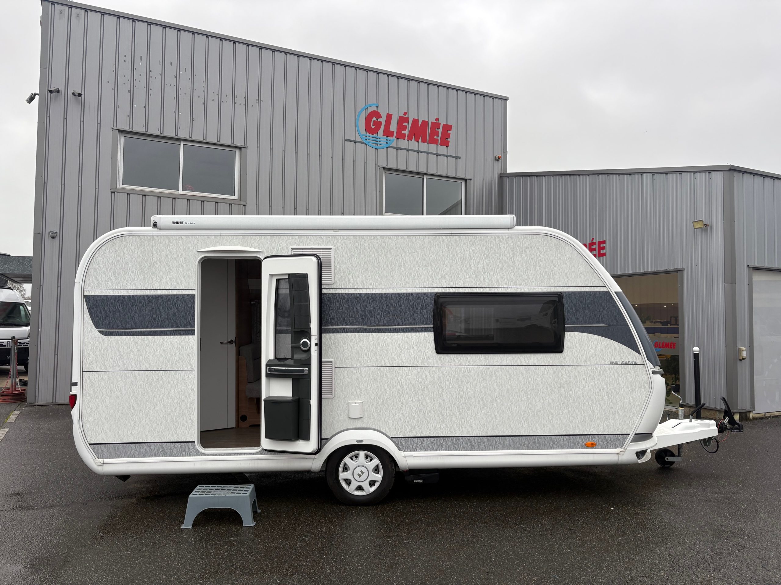 Caravane HOBBY avec un lit central, en très bon état.