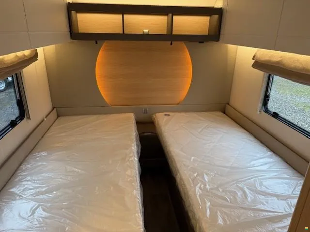 Caravane haut de gamme du constructeur allemand, avec lit jumeaux.